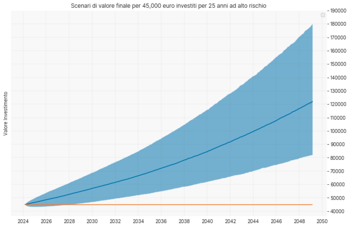 Guardando a un orizzonte temporale prolungato, come ad esempio i 25 anni di un ipotetico mutuo, potrebbe risultare vantaggioso considerare un approccio di investimento più aggressivo, che includa una significativa quota di azioni. Per Moneyfarm, un investimento iniziale di 45.000 euro potrebbe teoricamente crescere fino a raggiungere un valore di circa 122.000 euro in un contesto di base, escludendo gli effetti fiscali legati alle plusvalenze e i costi di gestione.