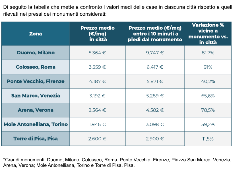 Una “classifica”  emerge dall’ultima analisi di Immobiliare.it Insights, la proptech company del gruppo di Immobiliare.it, che ha confrontato i prezzi delle case nel raggio di 10 minuti a piedi da alcuni tra i principali monumenti italiani.