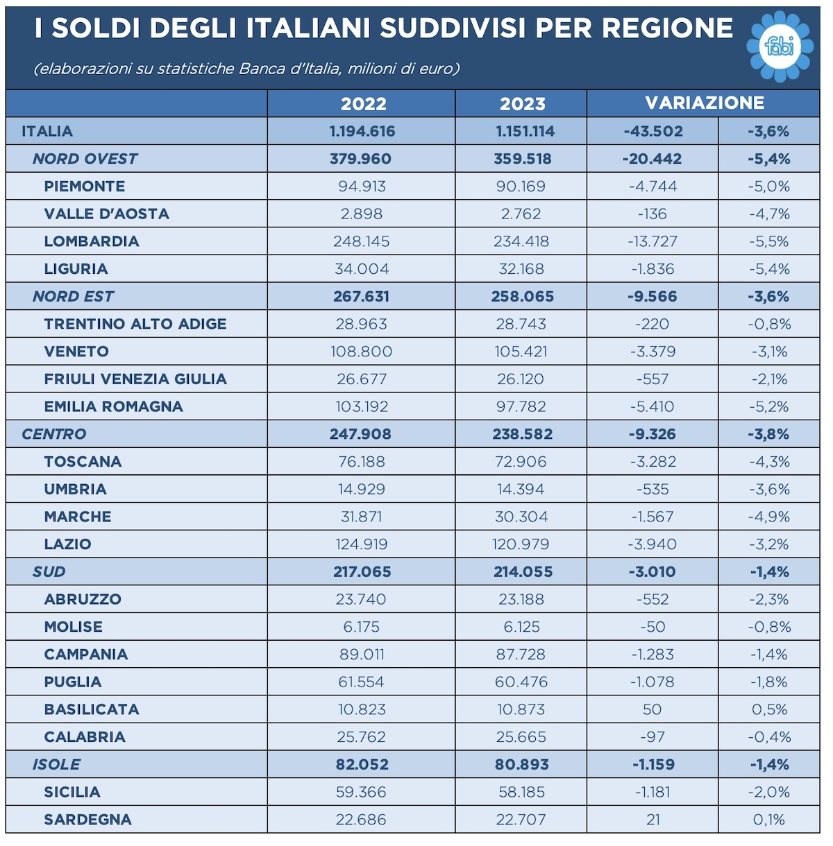 Escludendo unicamente la Sardegna e la Basilicata, dove è stata registrata una variazione positiva tra il 2022 ed il 2023 rispettivamente di 21 milioni e di 50 milioni di euro, il saldo dei conti correnti su base nazionale è sceso di 43 miliardi di euro nel corso degli ultimi dodici mesi.