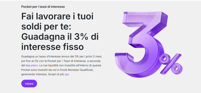 Si chiama [affiliate_link link_id=”4206″]Vivid Interest[/affiliate_link] il prodotto del conto Vivid Money con cui puoi generare interessi semplicemente depositando i tuoi risparmi. In sostanza, puoi guadagnare il 3% di interesse fisso per i primi due mesi, poi fino al 2% a seconda del piano che scegli.