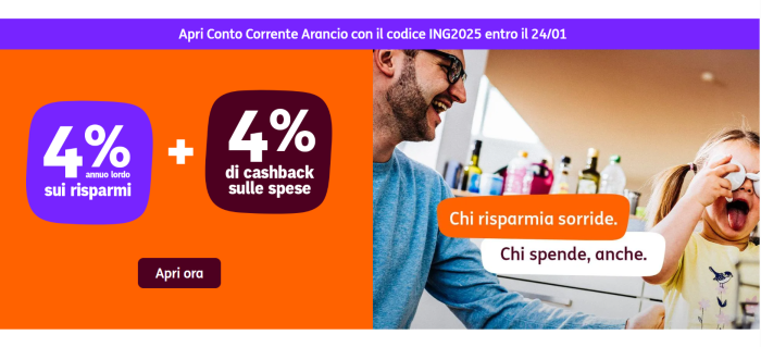 ING propone una nuova promozione dedicata ai suoi nuovi clienti: per un periodo limitato, è possibile ottenere il 4% di rendimento sulle somme versate in Conto Arancio e un 4% di cashback sugli acquisti effettuati con la carta di debito collegata a Conto Corrente Arancio Più.