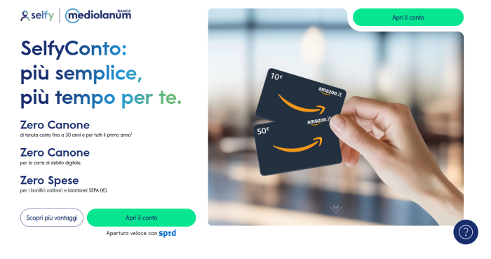La promozione attuale permette di ricevere fino a 60 euro in buoni regalo Amazon seguendo due semplici passaggi. Aprendo SelfyConto online entro il 31 dicembre e richiedendo la carta di debito collegata, si ottiene subito un primo buono da 10 euro. Il secondo incentivo, pari a 50 euro, viene riconosciuto effettuando una spesa minima di 50 euro entro il 31 gennaio con la Mediolanum Card, la carta di debito del circuito internazionale Mastercard associata al conto.
