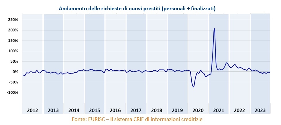 Volendo entrare maggiormente nel dettaglio, a risentire maggiormente dell’andamento a singhiozzo sono state le richieste di finanziamenti finalizzati, che hanno registrato un -10,4%. Tengono meglio i prestiti personali, per i quali la domanda è stata in crescita: +18,9%.