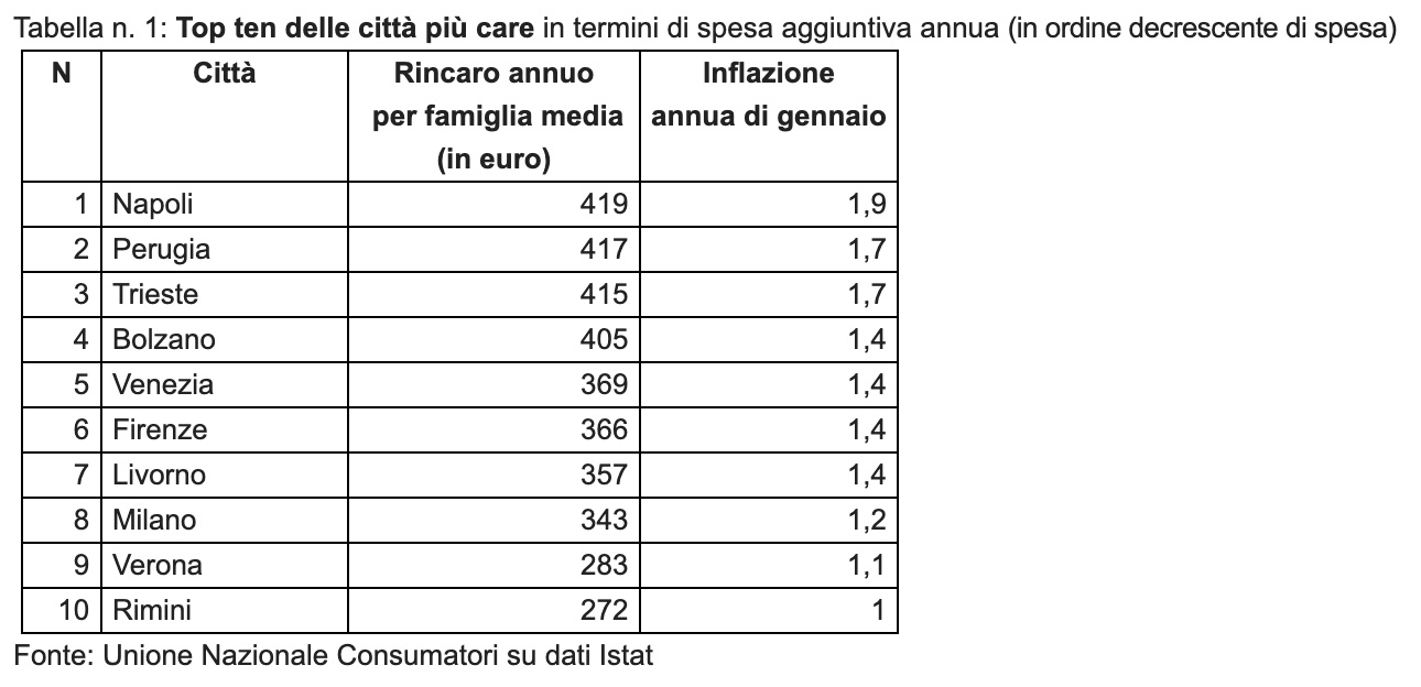 Sulla base dei dati resi noti dall’Istat sull’inflazione a gennaio nelle regioni e nei comuni con più di 150 mila abitanti, l’Unione Nazionale Consumatori ha stilato la top ten delle città più care del nostro paese, almeno in termini di aumento del costo della vita.