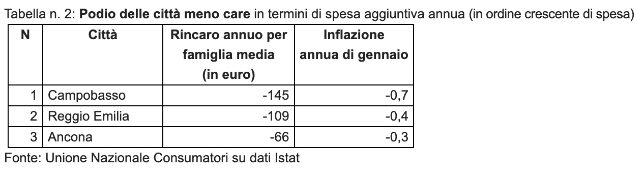 Subito dopo arriva Reggio Emilia, nella quale è stata registrata una riduzione dei prezzi pari allo 0,4%, che comporta un risparmio annuo di 109 euro per una famiglia media. Segue, poi, Ancona che con -0,3% ha un taglio delle spese pari a 66 euro annui per una famiglia media.