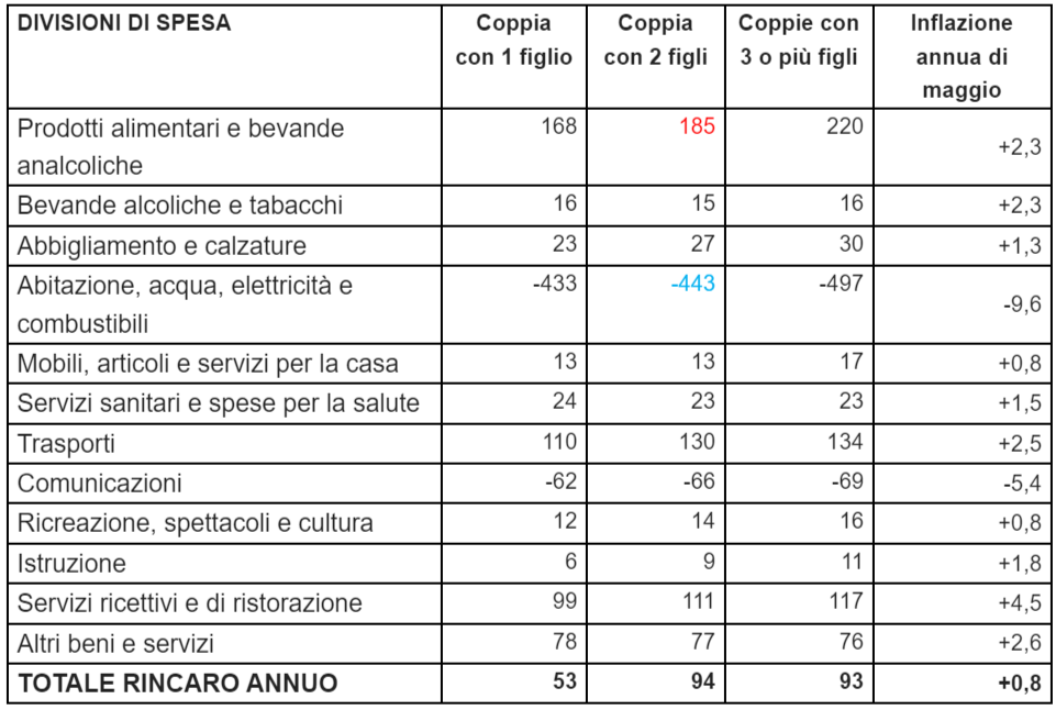 L’Unione fa poi i calcoli su quanto questo periodo di stabilità costa alle famiglie italiane. Per una coppia con due figli, l’inflazione tendenziale pari allo 0,8% significa un aumento del costo della vita pari a 94 euro su base annua, anche se ben 185 euro servono solo per far fronte ai rincari del 2,3% dei Prodotti alimentari e bevande analcoliche. Per una coppia con 1 figlio, la spesa aggiuntiva annua è pari a 53 euro, ma sono necessari ben 168 euro in più per mangiare e bere. Il primato alle famiglie numerose con più di 3 figli con un aggravio di 220 euro soltanto per nutrirsi e dissetarsi.