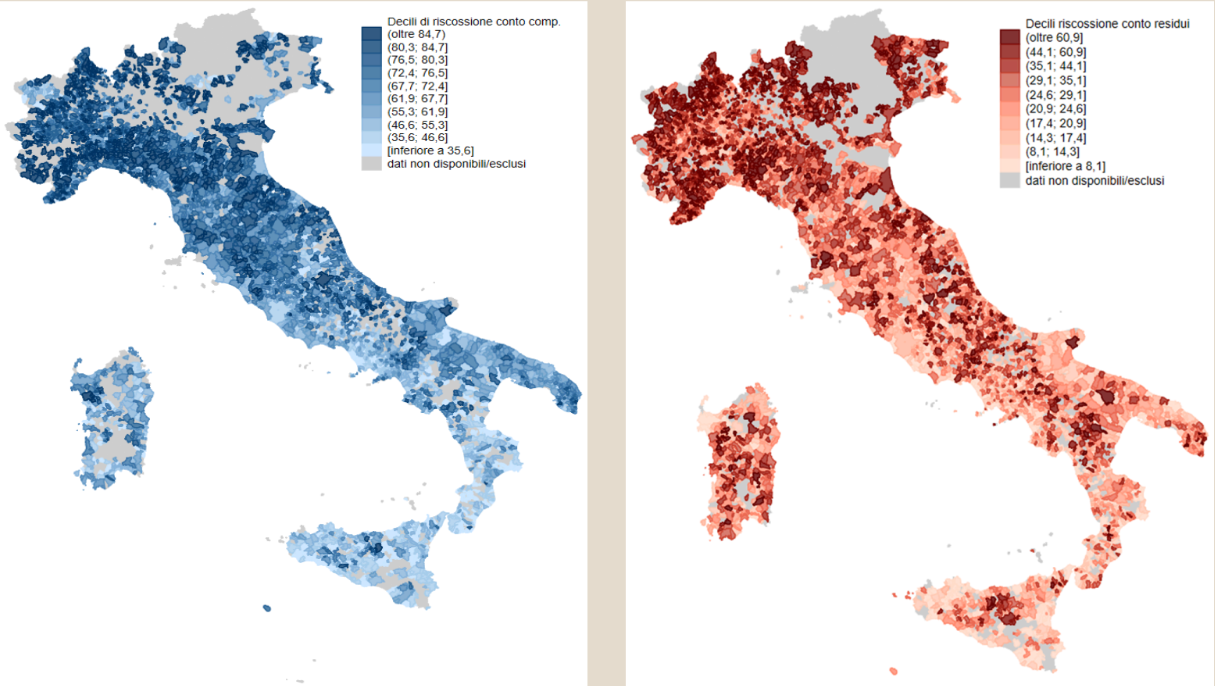 Nella grafica sottostante sono presenti i dati della riscossione in conto competenza (a sinistra) e quelli in conti residui (a destra).