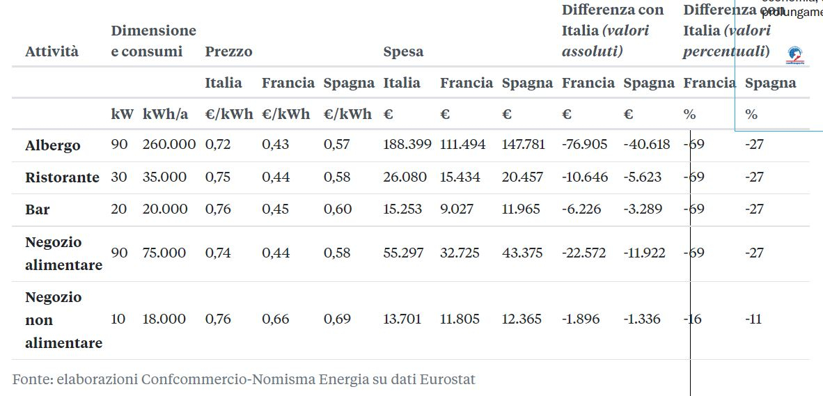 Italia maglia nera in Ue per il caro energia. Lo denuncia Confcommercio in un’indagine realizzata in collaborazione con Nomisma da cui emerge come le imprese del commercio, del turismo e della ristorazione italiane pagano di più rispetto alle medesime tipologie di imprese in Francia e Spagna, a parità di consumi e di potenza impegnata.
