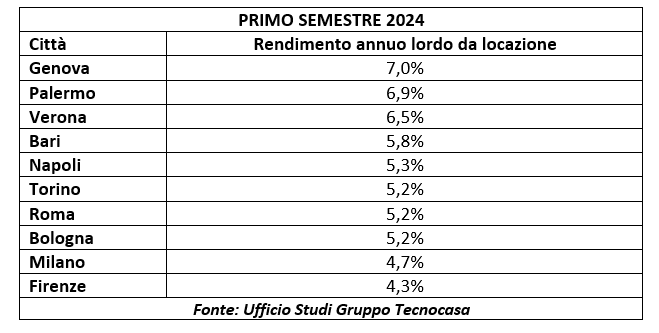Dall’analisi emerge,nel dettaglio, che nella prima parte del 2024 i rendimenti annui lordi da locazione nelle principali città italiane si mantengono su livelli interessanti, con alcune realtà particolarmente vantaggiose per gli investitori. I rendimenti annui da locazione restano comunque interessanti: per un bilocale di 65 mq nelle grandi città italiane si registra un rendimento pari al 5,6%.