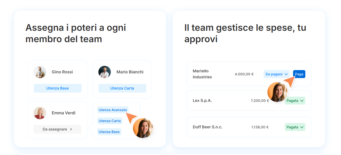 Inoltre, l’emissione delle carte per i dipendenti e la delega al commercialista aiutano a snellire ulteriormente i rimborsi e i pagamenti degli adempimenti fiscali, l’ideale per concentrarsi sull’attività.