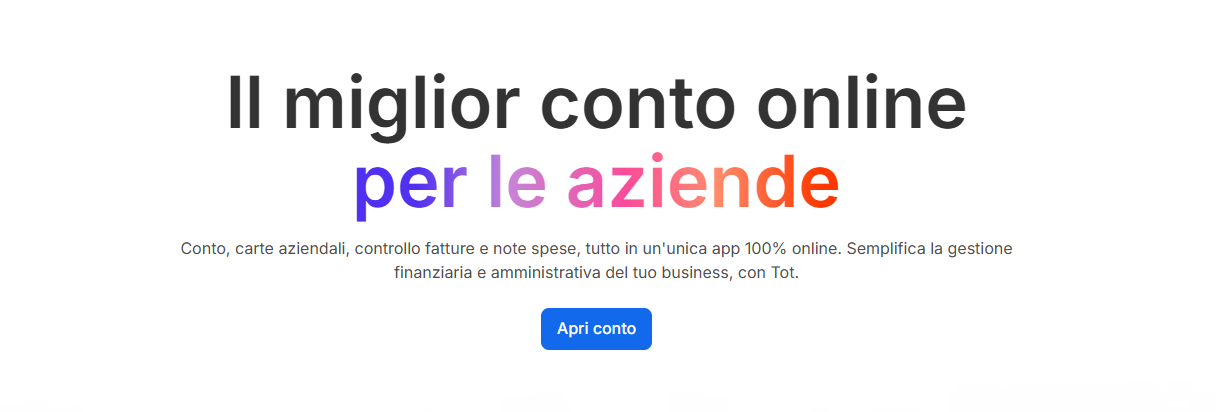 Tot è una fintech 100% che mette a disposizione una piattaforma aziendale completa per la gestione delle attività finanziarie ed amministrative. Offre servizi bancari innovativi permettendo di operare in autonomia dall’app o dal portale web.